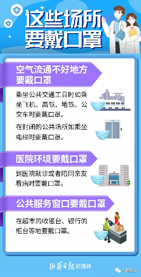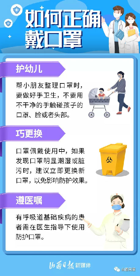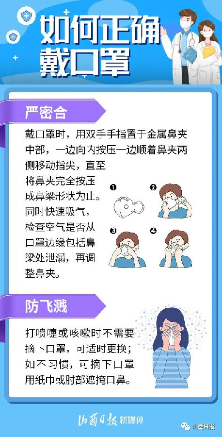 口罩是預(yù)防呼吸道傳染病的重要防線,不僅可以防止病人噴射飛沫,降低飛沫量和噴射速度,還可以阻擋含病毒的飛沫核,防止佩戴者吸入,從而有效降低新型冠狀病毒感染風(fēng)險(xiǎn)。如何正確戴口罩?哪些場(chǎng)所要戴口罩?一組海報(bào)告訴你——