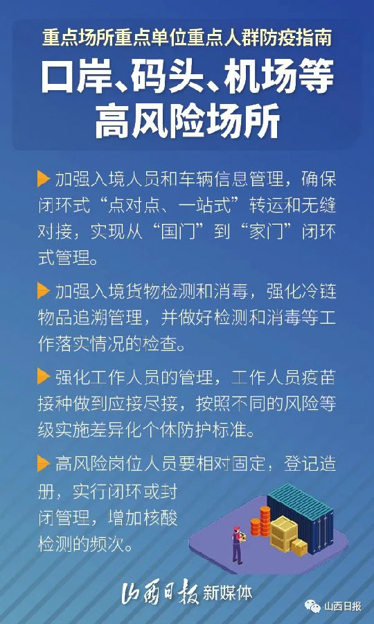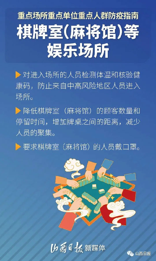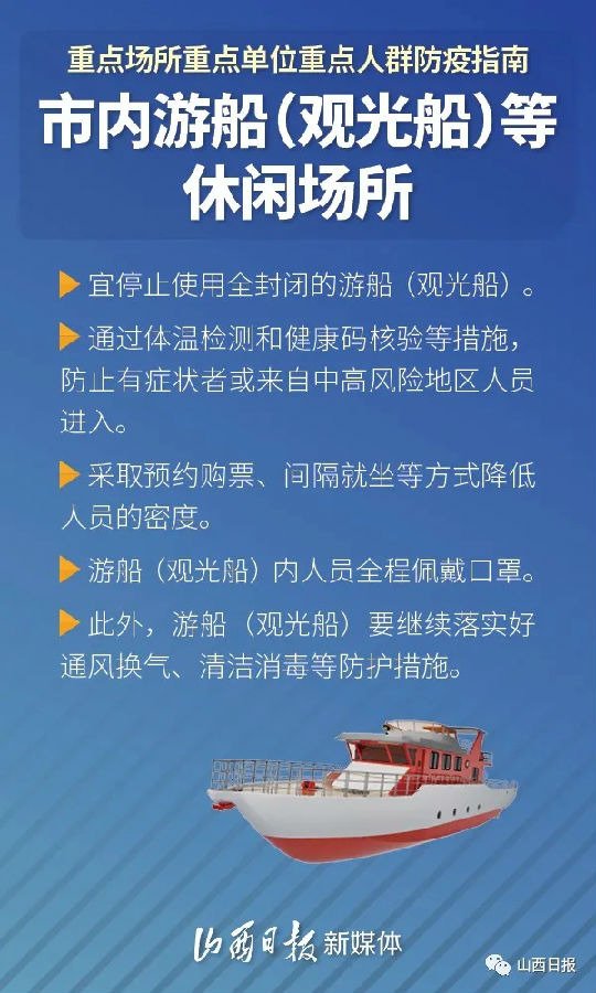 針對當前疫情防控形勢和人群流行特征,國家衛生健康委會同有關部門對戴口罩指引和重點場所重點單位重點人群防護指南進行了修訂,形成了《重點場所重點單位重點人群新冠肺炎疫情常態化防控相關防護指南(2021年8月版)》,其中對碼頭、口岸、棋牌室(麻將館)、游船(觀光船)等各類場所和單位的衛生防護提出新的要求。