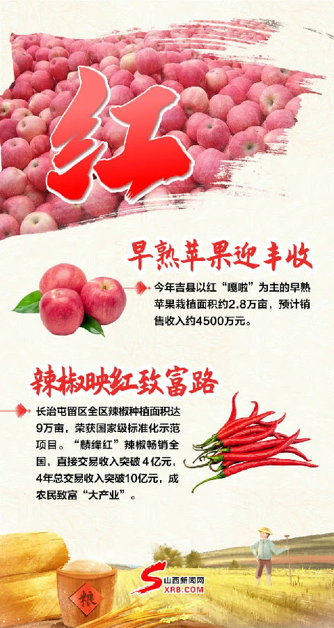 金黃的谷子垂下飽滿的穗子火紅的辣椒裝點著希望的田野……三晉大地,色彩斑斕迎豐收就在這個豐收的季節(jié)我們迎來第四個中國農(nóng)民豐收節(jié)下面請跟隨我們的“調(diào)色盤”一起來欣賞山西瓜果飄香谷滿倉的豐收景象