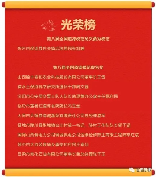 此外,山西錦豐泰和農(nóng)業(yè)科技股份有限公司董事長王雪,汾陽市公安局交警大隊(duì)大隊(duì)長助理兼辦公室主任甄利民,臨汾市蒲縣紅道養(yǎng)老院院長馮玉堂,大同市天鎮(zhèn)縣博誠蔬菜有限責(zé)任公司總經(jīng)理溫軍,晉城市陵川縣附城鎮(zhèn)臺(tái)北村第一書記、駐村工作隊(duì)隊(duì)長郭子涵,國網(wǎng)山西省電力公司晉城供電公司運(yùn)維檢修部正高級(jí)工程師宰紅斌,晉中市太谷區(qū)侯城鄉(xiāng)惠安村村民王春仙,呂梁市泰化石油有限公司董事長兼總經(jīng)理張子玉,生前系省水土保持科學(xué)研究所退休干部高文毓等9人榮獲第八屆全國道德模范提名獎(jiǎng)。