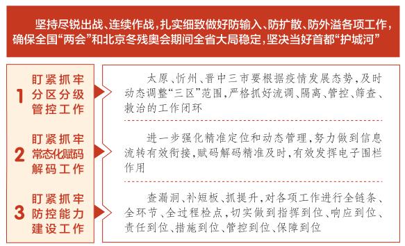 林武在講話中指出,當前,全省疫情防控形勢仍然十分嚴峻,太原、忻州、晉中三市正處在應急處置最吃緊的時候,特別是全國“兩會”和北京冬殘奧會召開在即,各級各部門要嚴明責任、嚴防死守,堅決有力打贏這場遭遇戰阻擊戰。一要盯緊抓牢分區分級管控工作。太原、忻州、晉中三市要根據疫情發展態勢,及時動態調整“三區”范圍,嚴格抓好流調、隔離、管控、篩查、救治的工作閉環。要配齊配強社區管控力量,科學合理增加隔離場所儲備,做到應急有備、處置有力。要特別關照好集中隔離的學生,讓大家安心學習、暖心生活。各市都要堅持問題導向,把握科學精準、適度從嚴的原則,牢牢把好關口。二要盯緊抓牢常態化賦碼解碼工作。進一步強化精準定位和動態管理,努力做到信息流轉有效銜接,賦碼解碼精準及時,有效發揮電子圍欄作用。對有疫情地區入返晉人員,必須做到第一時間賦碼、第一時間掌握、第一時間處置,根據研判結果,需要時必須做到第一時間開展流調排查。所有法人單位和具備封閉管理條件的社區(村)都要嚴格執行驗碼、測溫、戴口罩“三要素”,學校、酒店、商超、交通場站等重點場所都要設置查驗卡口,一線防控人員都要做到嚴格查驗,真正讓健康碼發揮作用。三要盯緊抓牢防控能力建設工作。深刻汲取有關聚集性疫情教訓,查漏洞、補短板、抓提升,對各項工作進行全鏈條、全環節、全過程檢點,切實做到指揮到位、響應到位、責任到位、措施到位、管控到位、保障到位。流調過程中,要充分運用信息化和大數據手段,切實提高疫情防控的精準性有效性。要針對疫情防控工作落實持續開展督查,督促各地事不過夜、立行立改,切實以督查推動責任落實、推動問題整改、推動能力提升。