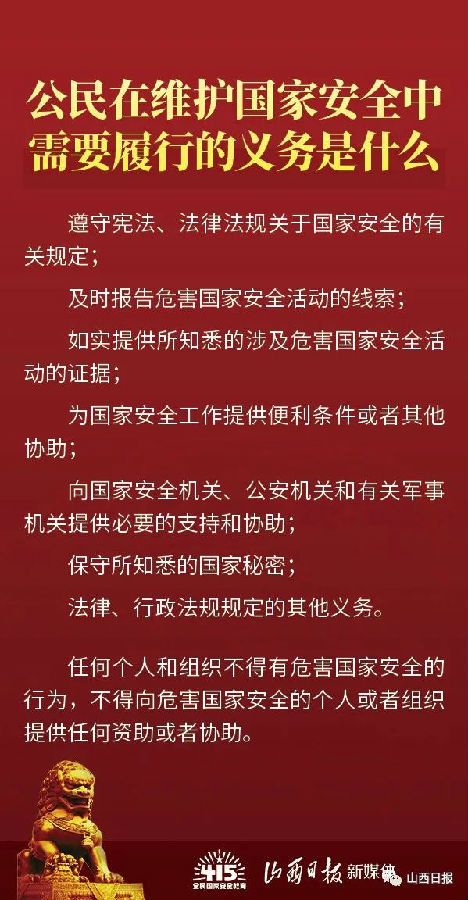 全民國家安全教育日是為了增強(qiáng)全民國家安全意識,維護(hù)國家安全而設(shè)立的節(jié)日。2015年7月1日,全國人大常委會通過的《中華人民共和國國家安全法》第十四條規(guī)定,每年4月15日為全民國家安全教育日。