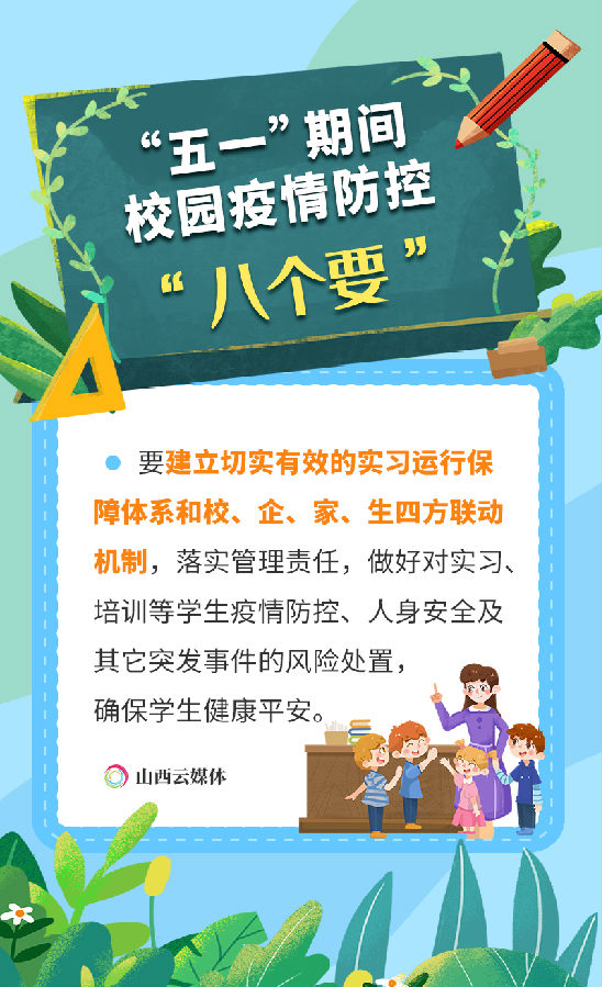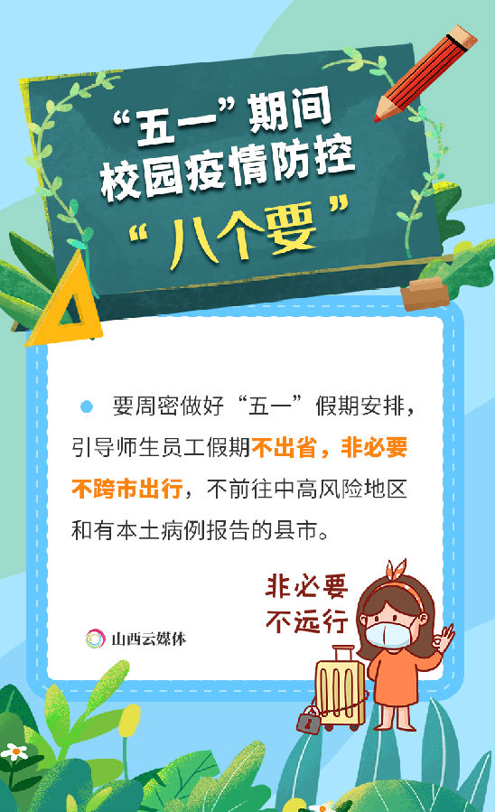4月27日,省教育廳召開全省教育系統(tǒng)第三十六次疫情防控視頻調(diào)度會議,安排部署近期特別是“五一”期間教育系統(tǒng)疫情防控重點(diǎn)任務(wù)。引導(dǎo)師生員工假期不出省,非必要不跨市出行,不前往中高風(fēng)險地區(qū)和有本土病例報告的縣市。