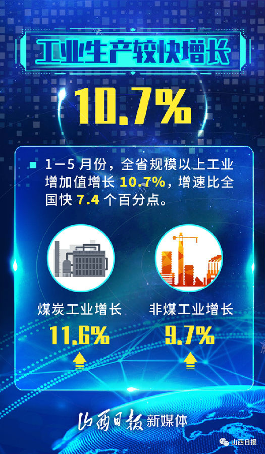 規模以上工業增加值增長10.7%、社會消費品零售總額2894.6億元、城鎮新增就業21.6萬人……6月20日,山西省統計局發布了1-5月份全省經濟運行情況。1-5月份,全省高效統籌疫情防控和經濟社會發展,扎實推動穩經濟一攬子政策措施落地見效,工業生產較快增長,投資規模繼續擴大,市場消費穩定恢復,經濟社會發展大局穩定。