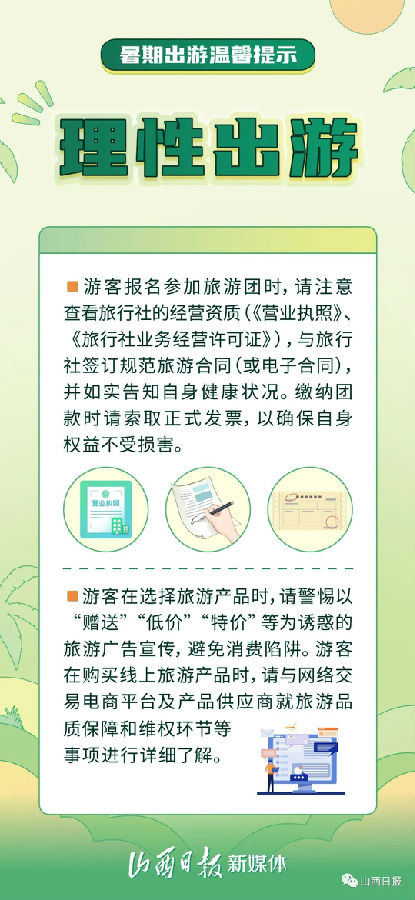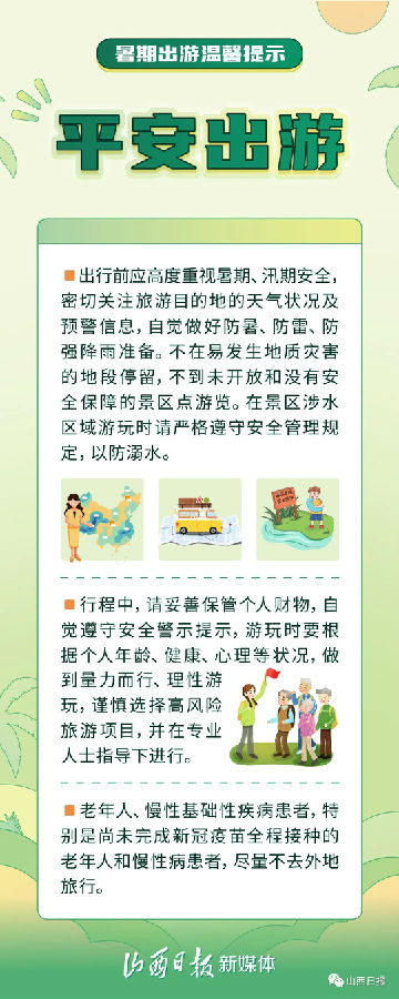 暑期來臨,隨著國內疫情防控形勢平穩向好,以及科學精準實施跨省旅游“熔斷”機制,民眾出游熱情高漲,旅游市場進入旺季,外出旅游安全風險增大。為保障廣大游客平安、健康、文明出游,我們提醒民眾強化安全防范意識,做到安全出行、快樂旅游、平安回家。
