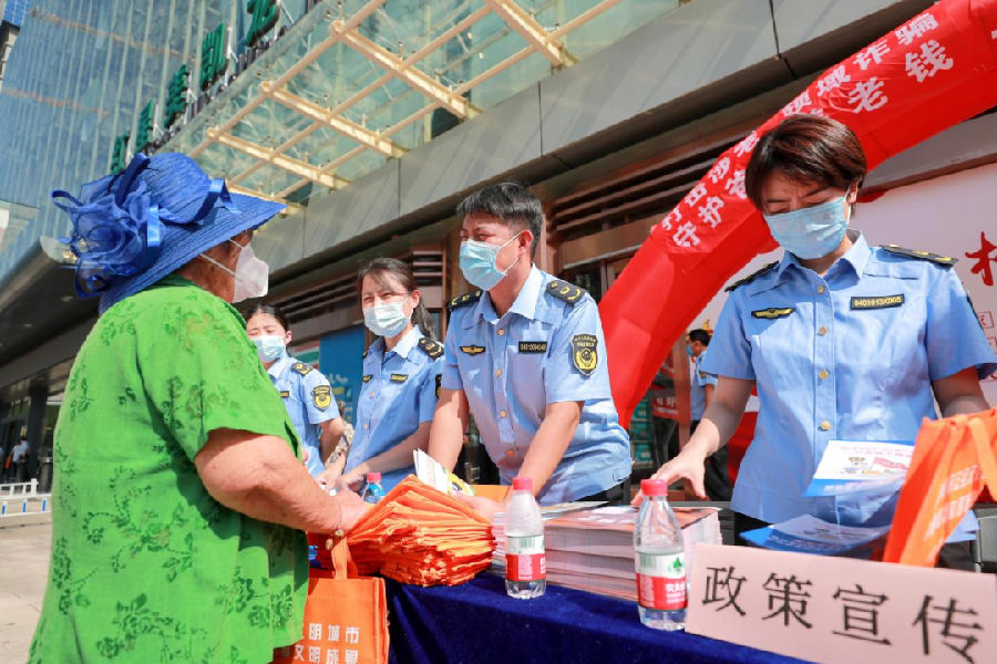7月29日上午,在省城長風街一大型商場外,山西省、太原市、小店區(qū)三級市場監(jiān)督管理局聯(lián)合舉辦“打擊涉老領(lǐng)域詐騙,守護爸媽養(yǎng)老錢”主題宣傳活動,身著制服的工作人員向過路市民宣傳講解涉老領(lǐng)域詐騙的危害與相應(yīng)防范措施,以提高廣大市民的甄別與防范意識。
