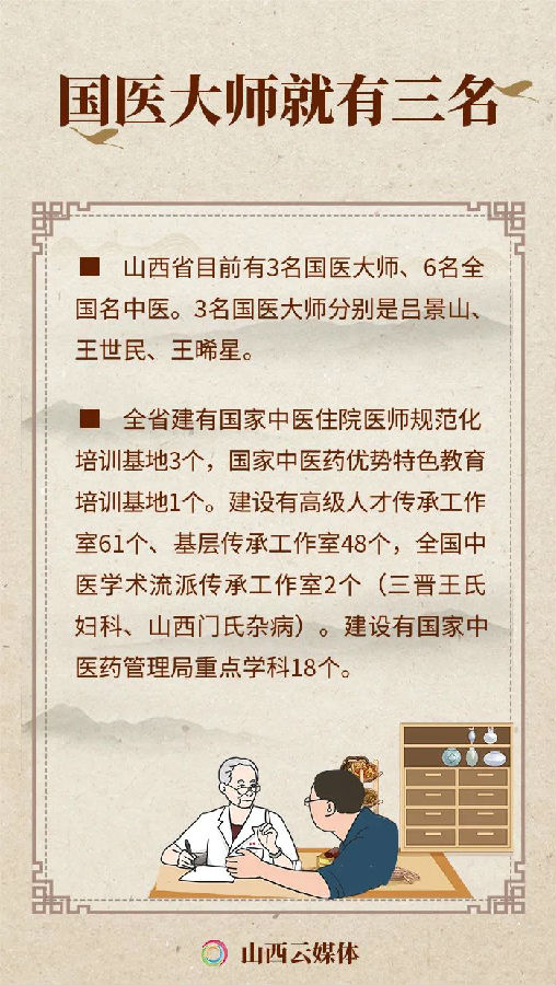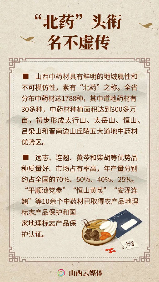 你知道山西的中藥材有多少種嗎?你知道山西的名中醫(yī)有哪些嗎?你知道山西有多少名牌中藥嗎?8月1日上午,山西云媒體記者從山西省政府新聞辦舉行的新聞發(fā)布會了解到,山西這個中醫(yī)藥大省有著豐富的中醫(yī)藥資源。6張海報,幫你讀懂山西中醫(yī)藥資源“稟賦”。