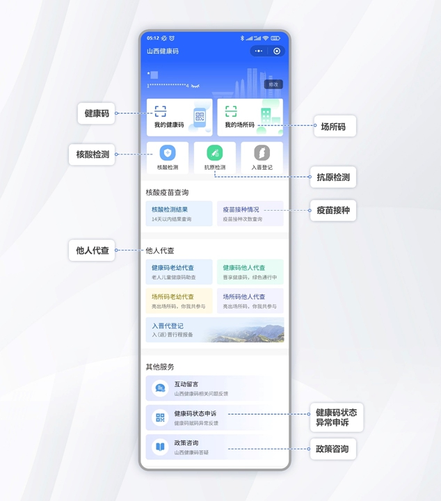 微信健康碼對防疫常用的功能進行了統一聚合,首頁顯示健康碼、場所碼、核酸檢測、抗原檢測、疫苗接種、他人代查、健康碼狀態異常申訴、政策咨詢等功能。可以說,日常所需的疫情防控應用“應有盡有”,市民無需在多個程序間來回切換,極大方便了日常使用。