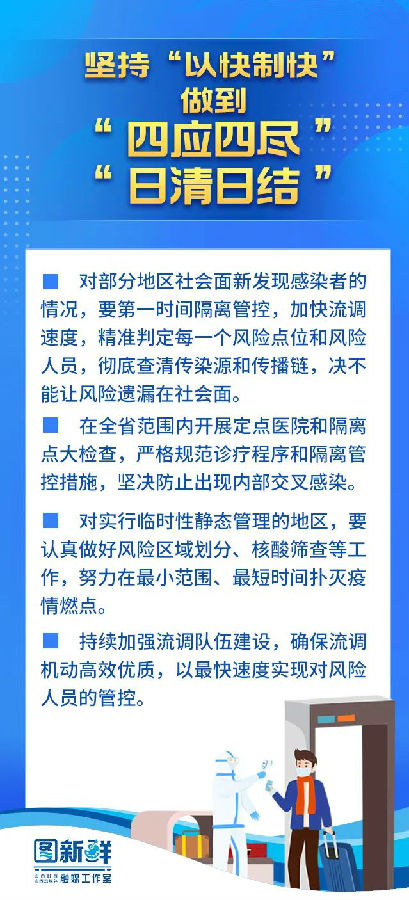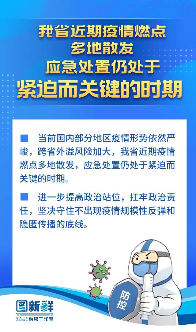 他強調,要堅決貫徹疫情防控總策略和總方針,按照省委“早、快、準”要求,加力加速打好應急處置殲滅仗,慎終如始打好外防輸入持久仗,加快實現輸入性散發疫情見底清零,堅決守牢山西陣地。