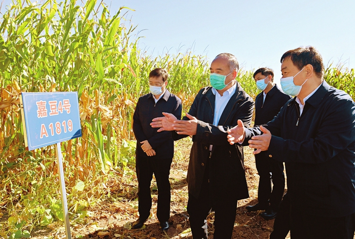 今年我省把大豆玉米帶狀復合種植作為農業生產主推技術,共推廣了80多萬畝,覆蓋全省近一半縣(市、區)。秋糧收獲在即,帶狀復合種植模式收成如何,林武十分關心。他來到小店區西溫莊鄉南王名村的大豆玉米帶狀復合種植基地,詳細了解往年收成和今年情況,同基地負責人一筆一筆算成本賬、收益賬。當聽到不包括政府補貼,畝均比原來凈增加三四百元收益時,林武十分高興,連連說道“這充分說明大豆玉米帶狀復合種植是大有前途的”。秋日暖陽下,一體收割機在農田里往來穿梭,收割、脫粒、裝袋等流程一次性完成。林武饒有興致地觀看農機作業,他指出,大豆玉米帶狀復合種植是實現農業增效、農民增收的創新手段。各地各有關部門要加強全周期服務,做好政策引導和培訓指導,保障農業生產用水用能,加強適用型農機農具改進研發,發展適度規模經營,確保把這項示范推廣工程做好做扎實,讓農民種糧能獲利、多得利。當前要做好不同大豆品種、不同套種模式、不同栽培方式下的測產評估工作,為指導好明年生產工作夯實基礎。