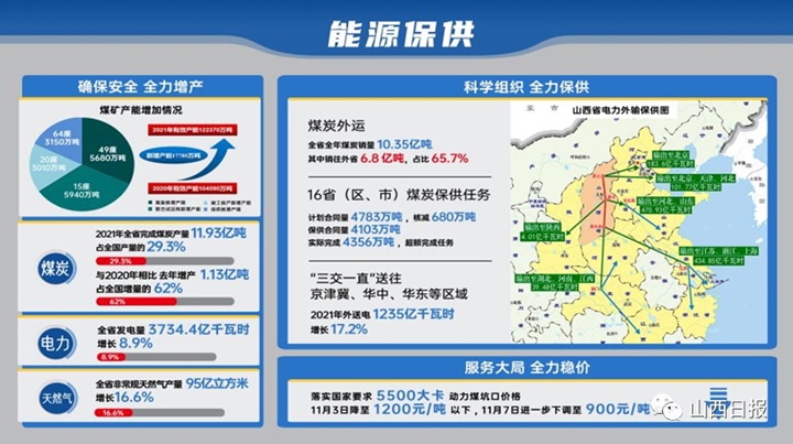 2021年,全省規上原煤增產1.13億噸,發電量同比增長8.9%,非常規天然氣產量同比增長16.6%,全力保障國家能源安全。