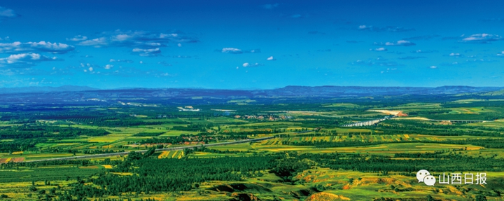 堅持不懈植樹造林,創造了荒漠變綠洲的生態奇跡。圖為山西省右玉縣鳥瞰圖。