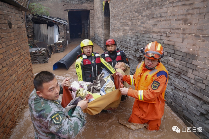充分發揮基層黨組織戰斗堡壘作用和共產黨員先鋒模范作用,危難之際沖鋒在前。圖為山西省祁縣黨員干部洪災搶險一線搶救受困群眾。