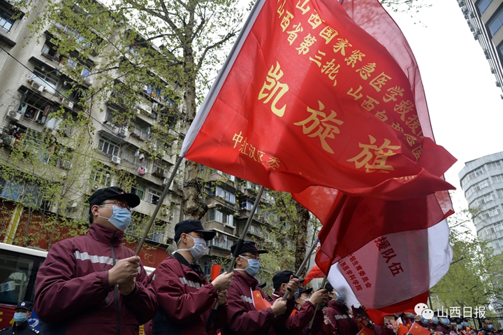 面對突如其來的新冠肺炎疫情,山西省先后派出13批1516名醫護人員支援湖北,其中共產黨員583名,火線入黨342名。圖為2020年3月,湖北省武漢市江漢區委、區政府贈授給山西國家緊急醫學救援隊的凱旋旗。