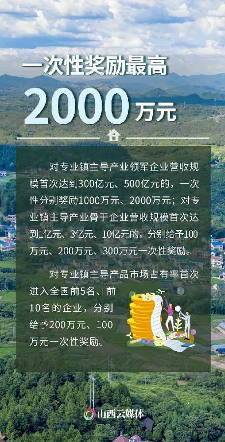 近日,山西省人民政府辦公廳印發(fā)《山西省支持專業(yè)鎮(zhèn)高質量發(fā)展的若干政策》,促進專業(yè)鎮(zhèn)高質量發(fā)展。一組數(shù)據(jù)聚焦“硬核”舉措,看看支持力度有多大。