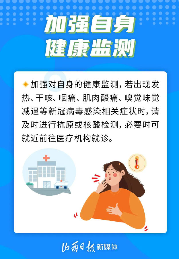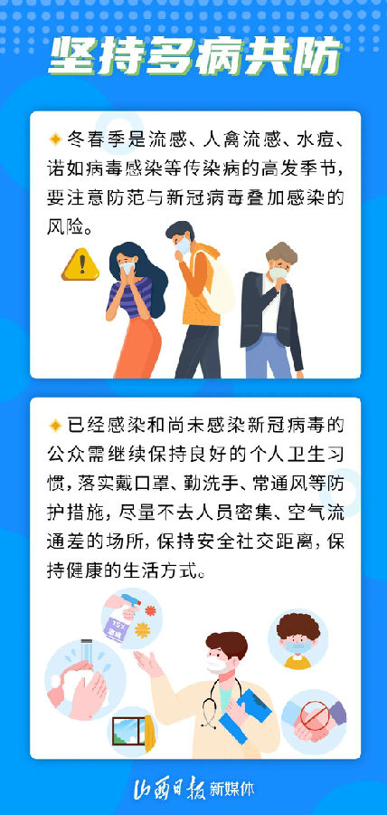 當前,新冠病毒感染已調整為“乙類乙管”,疫情防控進入新階段。2月8日,山西省疫情防控辦溫馨提示,現階段仍應繼續堅持做好個人防護和自身健康監測,守護自己和家人的生命安全和身體健康。