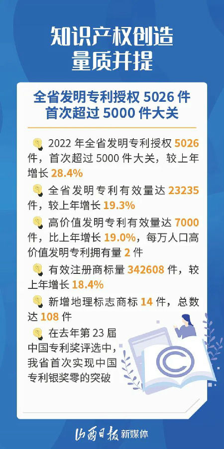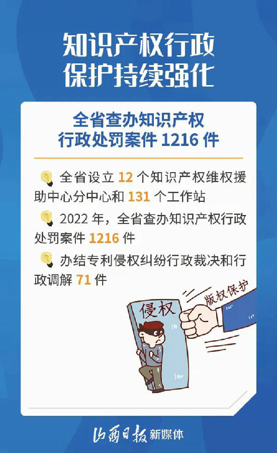 2022年全省發明專利授權5026件,全省法院共審理各類知識產權案件3711件,共批準逮捕侵犯知識產權犯罪案件106件175人……今年4月26日是第23個世界知識產權日,為加強知識產權保護宣傳教育,提升公眾尊重和保護知識產權的意識,4月20日,省政府新聞辦召開山西省知識產權保護工作新聞發布會,介紹我省知識產權保護情況。