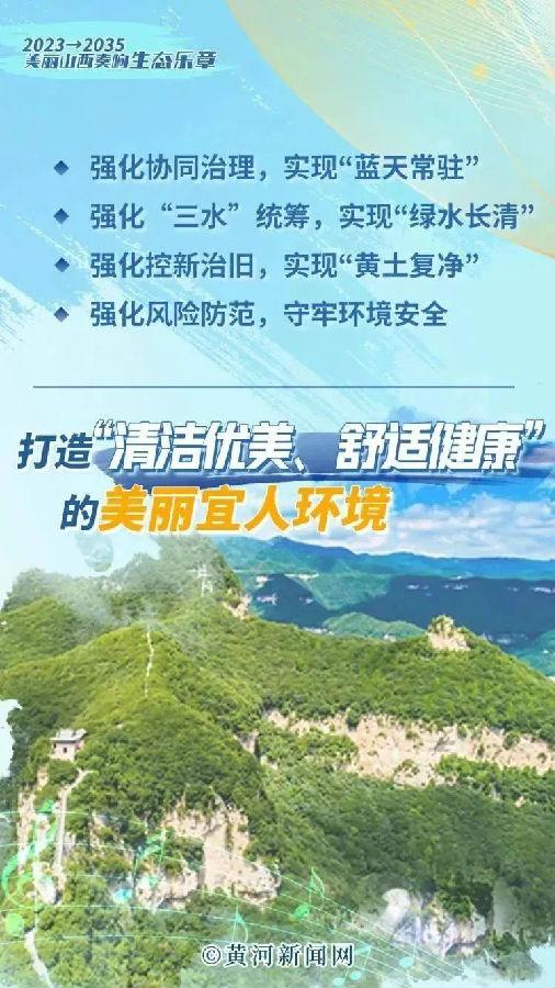 2025年山西省經(jīng)濟(jì)高質(zhì)量發(fā)展實(shí)現(xiàn)新突破,轉(zhuǎn)型發(fā)展形成重大標(biāo)志性成果,美麗山西建設(shè)短板加快補(bǔ)齊,生產(chǎn)生活方式綠色轉(zhuǎn)型初見成效,生態(tài)環(huán)境質(zhì)量持續(xù)好轉(zhuǎn),生態(tài)系統(tǒng)質(zhì)量和穩(wěn)定性進(jìn)一步提升,現(xiàn)代環(huán)境治理體系基本健全;2030年美麗山西建設(shè)成效顯著;2035年人與自然和諧共生的美麗山西全面呈現(xiàn)。
