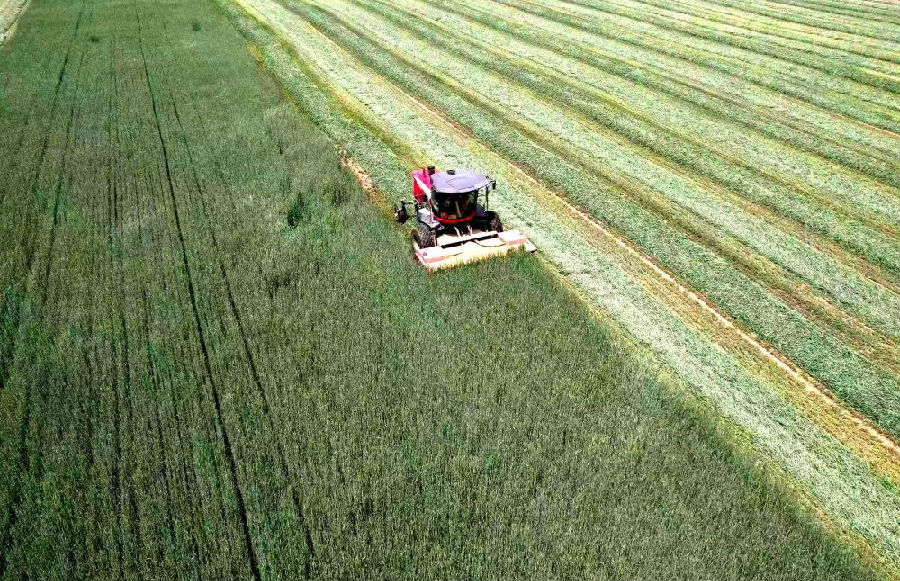 收割機正在收割飼用小黑麥。新華社記者 魏飚 攝