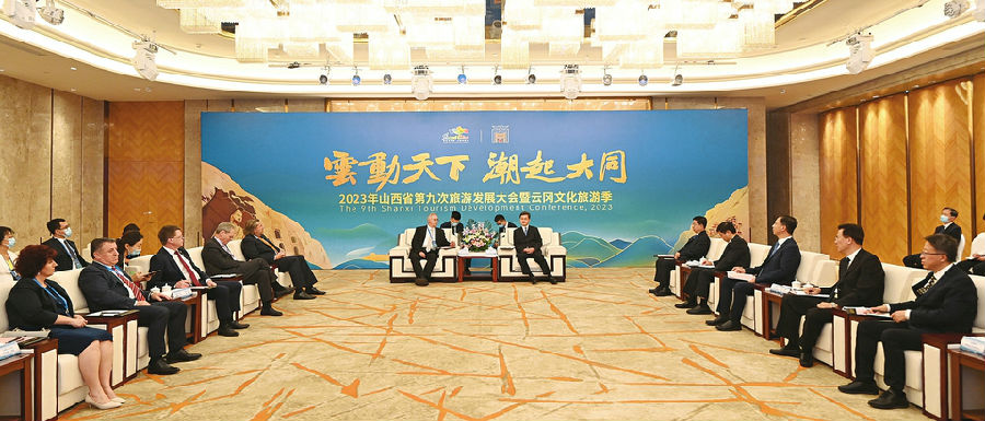 藍(lán)佛安代表省委、省政府對各位外賓表示歡迎,對大家積極推動(dòng)各國與中國及山西的友好交往表示感謝,并以早期人類故鄉(xiāng)、華夏文明搖籃、國家綜合能源基地、國家資源型經(jīng)濟(jì)轉(zhuǎn)型綜改試驗(yàn)區(qū)、夏養(yǎng)康養(yǎng)勝地“五張名片”對山西省情進(jìn)行了介紹。他說,山西歷史悠久、文化燦爛、資源豐富,在全國發(fā)展大格局中具有重要地位。近年來,在以習(xí)近平同志為核心的黨中央堅(jiān)強(qiáng)領(lǐng)導(dǎo)下,山西錨定到2030年基本實(shí)現(xiàn)轉(zhuǎn)型、2035年基本實(shí)現(xiàn)現(xiàn)代化“兩個(gè)基本實(shí)現(xiàn)”的奮斗目標(biāo),勇?lián)D(zhuǎn)型發(fā)展、能源革命等重大使命,推動(dòng)經(jīng)濟(jì)發(fā)展、產(chǎn)業(yè)升級、文化繁榮、生態(tài)環(huán)保、深化改革、擴(kuò)大開放、民生保障等各方面工作取得新進(jìn)展新成效。旅游是傳播文明、交流文化、增進(jìn)友誼的橋梁。山西是文旅資源大省,厚重的歷史、燦爛的文化、壯美的山河、宜人的氣候、豐饒的物產(chǎn)和別具特色的風(fēng)土人情,為三晉大地增添了獨(dú)特魅力。希望以這次旅游發(fā)展大會為契機(jī),積極開展多種形式的文旅合作,共同舉辦豐富多彩的交流活動(dòng),讓更多外國游客開啟精彩難忘的“發(fā)現(xiàn)山西之旅”。藍(lán)佛安還向與會外賓提出深化交流合作的三點(diǎn)倡議。一是傳播山西友好聲音,積極講述山西故事、介紹山西文化、推介山西品牌,幫助提高山西在各國人民心中的知名度、美譽(yù)度,持續(xù)激發(fā)民間友好熱情。二是深化彼此交流交往,用好各方面常態(tài)化交流合作機(jī)制,深入推進(jìn)國際友城建設(shè),為共享發(fā)展機(jī)遇、共筑美好未來提供有力支撐。三是開展務(wù)實(shí)有效合作,依托共建“一帶一路”等機(jī)遇,深化能源、制造業(yè)等方面產(chǎn)業(yè)對接,強(qiáng)化經(jīng)貿(mào)、科技、教育、人文、旅游等方面交流合作,在更高層次、更寬領(lǐng)域?qū)崿F(xiàn)互利共贏。