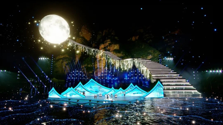 節目的舞美設計以“放歌山水間”為概念,強化“思想+藝術+技術”融合,在山西省晉中市左權縣“百里畫廊”山間打造了具有山水元素、虛實結合的實景舞臺,依托總臺AR技術,呈現了豐富多彩的民歌舞臺景觀。