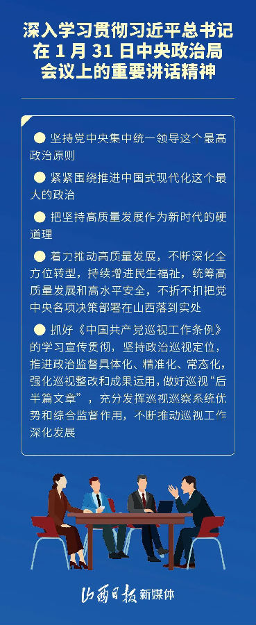 2月5日,省委召開常委會會議,傳達學習習近平總書記在1月31日中央政治局會議和中央政治局第十一次集體學習時的重要講話精神,傳達學習習近平總書記在天津考察重要講話精神和李強總理在晉調研指示精神,研究我省貫徹落實意見,深入學習《關于黨的二十大以來中央政治局貫徹執行中央八項規定情況的報告》《關于黨的二十大以來整治形式主義為基層減負工作情況的報告》,傳達貫徹中央主題教育總結會議、中央層面整治形式主義為基層減負專項工作機制會議精神,聽取全省公安工作情況匯報。省委書記唐登杰主持會議。