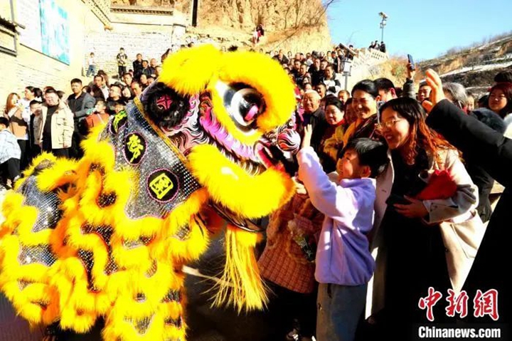 舞獅表演者為前來(lái)圍觀的民眾送上新春祝福。白鵬偉 攝
