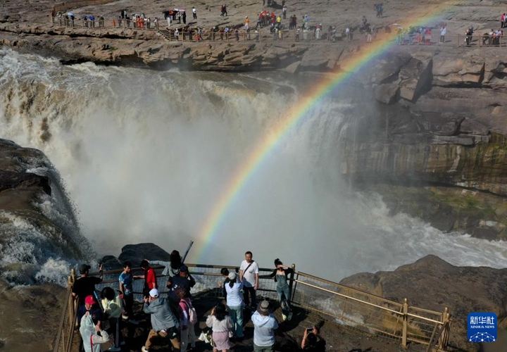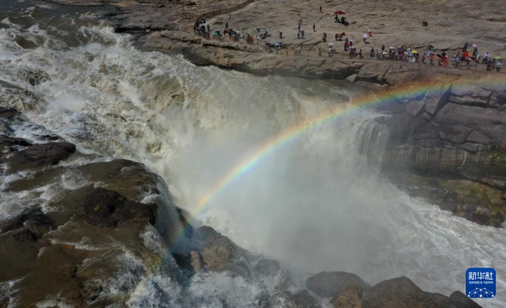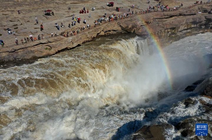 當日,受降雨影響,黃河壺口瀑布水量增大,河水翻滾而下,飛濺起的水霧在陽光的照射下,形成“彩橋通天”景觀。