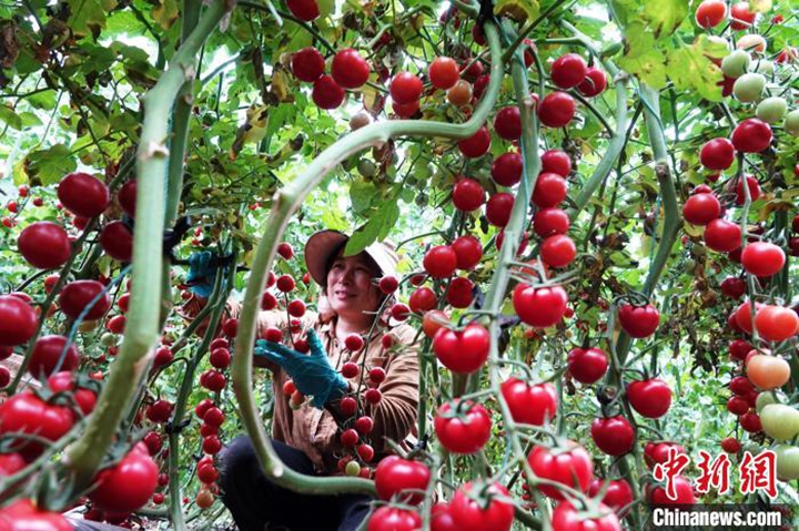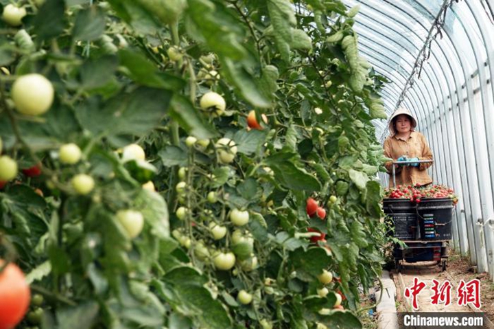 6月18日,夏至將至,山西省設施蔬菜大縣運城市新絳縣,西紅柿、黃瓜等30多個品種10萬畝設施蔬菜進入產銷旺季。圖為三泉鎮席村菜農韓春燕冒著高溫天氣搶收圣女果。 高新生 攝