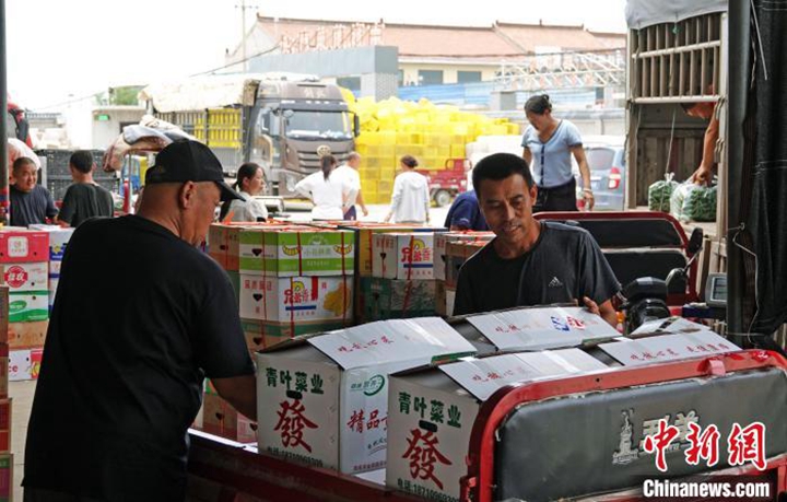 6月18日,夏至將至,山西省設施蔬菜大縣運城市新絳縣,西紅柿、黃瓜等30多個品種10萬畝設施蔬菜進入產銷旺季。圖為菜農在泉掌鎮南張村蔬菜批發市場為客商裝車蔬菜。 高新生 攝