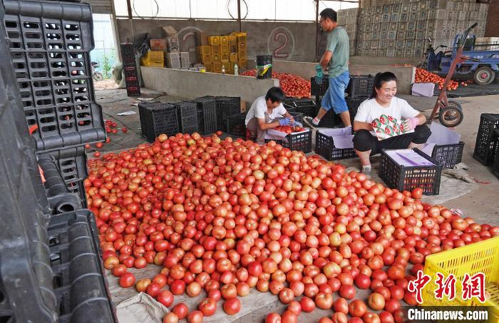 6月18日,山西省運城市新絳縣泉掌鎮王守莊村蔬菜批發市場,菜農冒著高溫天氣為客商裝箱西紅柿。 高新生 攝
