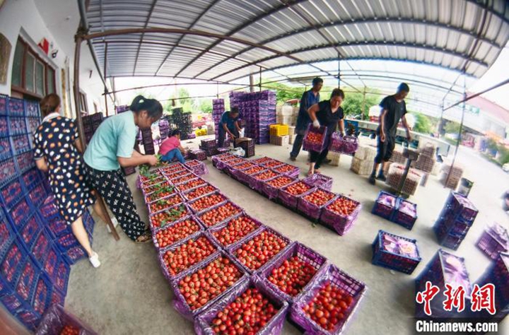6月18日,山西省運城市新絳縣泉掌鎮王守莊村蔬菜批發市場,菜農冒著高溫天氣為客商裝箱圣女果。 高新生 攝