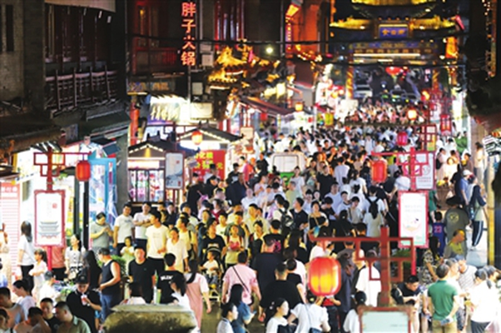 國家級旅游休閑街區(qū)鐘樓街同樣人氣火爆。夜幕降臨,華燈亮起,鐘樓街燈光璀璨,各地游客興致勃勃地走在青灰色民國式建筑群間,將腳步放慢,感受這座城市的律動。作為城市會客廳,鐘樓步行街7月接待的客流同比增加52.73%。旺盛的人氣折射了太原暑期旅游市場熱度。