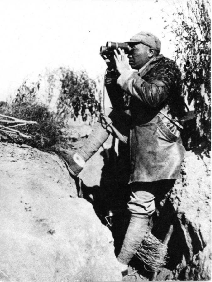 “誰敢橫刀立馬,唯我彭大將軍。”照片中,彭德懷大半個身體露在戰壕外,左腳踏在戰壕底,右腳蹬著戰壕前沿,坐靠在戰壕后沿上,手持望遠鏡,神情專注地觀察戰況。