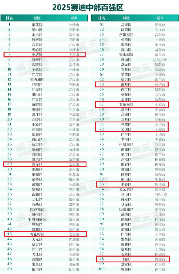 近日,賽迪顧問發布2025中西部縣域、城區經濟高質量發展研究成果,中部百強縣、中部百強區等榜單出爐。山西省澤州縣、沁水縣上榜中部百強縣榜單,分別位列第61、第96位;太原市小店區、迎澤區、杏花嶺區、萬柏林區,長治市潞州區,臨汾市堯都區,大同市云岡區,朔州市平魯區,晉城市城區9個區上榜中部百強區榜單。