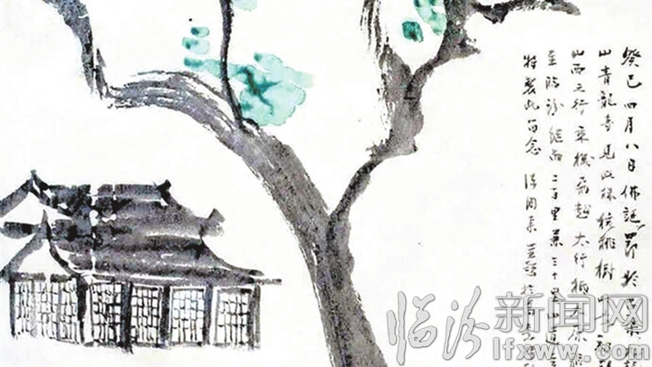 畫面文字:癸巳(2013年)四月初八佛誕節,于呂梁九龍山青龍寺,見此株核桃樹。此是初到山西之行。乘機飛越太行,抵太原,驅車至臨汾。繼而二百里兼三十里山道至此。特制此留念。 陳鵬舉題于萬憙樓