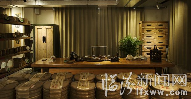 花梨木和布郎族平瓦組合設計的柜臺、鋪著筆墨紙硯的巨大書案、收藏著各種精致物件的百寶閣、用普洱茶磚壘起的吧臺背景墻……我有些目不瑕接了,可惜只有一雙眼睛,只好一邊貪婪地掃描,一邊聽堂主的介紹——吧臺的背景墻,是他用1.2噸的古樹普洱茶磚壘起來的,紫砂壺展廳的架上有1.3噸,加上餅茶全部藏品有5噸左右,這些都來自他在布郎山租種的四十畝古樹普洱茶園……