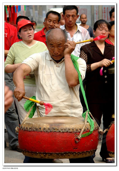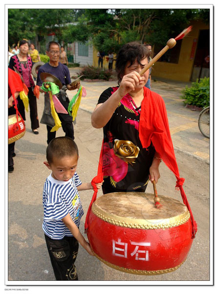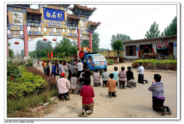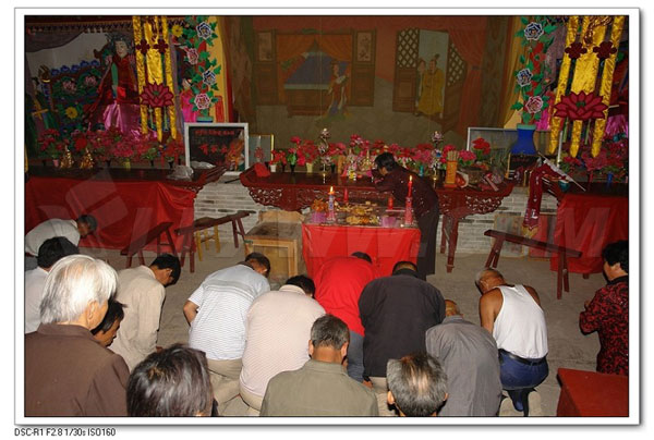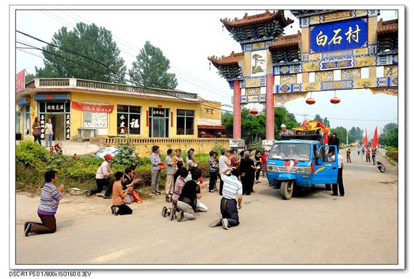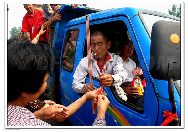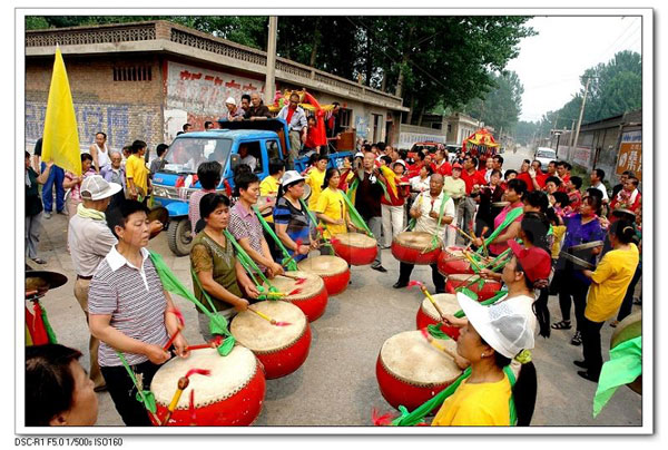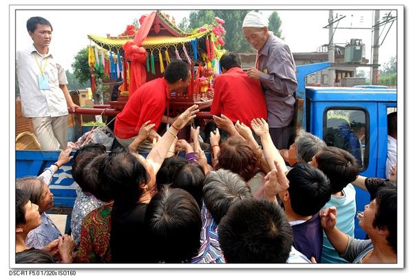 迎親隊伍途經的每個村,都會組織自己的鑼鼓隊和迎接隊伍。在村口跪拜完畢,斗罷了鑼鼓,他們便將駕樓迎進本村的娘娘廟歇息。村中百姓則在自家門口擺好供桌和供品。駕樓經過,男女老少紛紛跪下叩拜,用功德錢換吉祥索(開光后的紅黃絲帶),并將“親戚”搶回家款待。