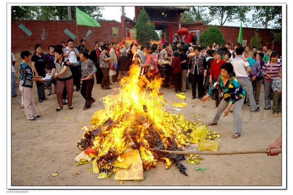 今天,羊獬、歷山兩地的居民分別自認為是堯、舜的后裔。因此,羊獬人稱娥皇、女英二位女神為“姑姑”,而歷山則稱為“娘娘”。兩地居民互稱“親戚”,且無論年紀大小,永遠相差一輩。每年農歷三月初三(時間接近清明,人們理應回家祭祖掃墓),二位娘娘由羊獬人從歷山接回娘家省親,直到四月二十八(當地認為是堯的生日),歷山人一起到羊獬祝壽,并將二位娘娘迎回到歷山。兩地因此逐漸形成了“接姑姑迎娘娘”的走親民俗活動。