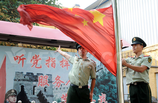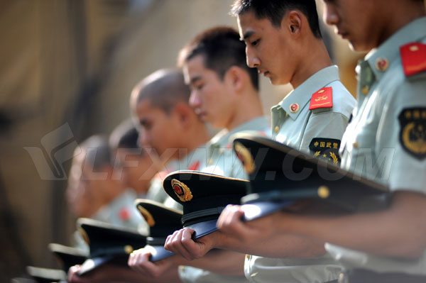 8月15日,臨汾市武警支隊(duì)的武警戰(zhàn)士為甘肅舟曲特大山洪泥石流遇難同胞默哀。為表達(dá)全國(guó)各族人民對(duì)甘肅舟曲特大山洪泥石流遇難同胞的深切哀悼,國(guó)務(wù)院決定,8月15日舉行全國(guó)哀悼活動(dòng),全國(guó)和駐外使領(lǐng)館下半旗志哀,并停止公共娛樂(lè)活動(dòng)。 (記者 閆銳鵬 攝影報(bào)道)