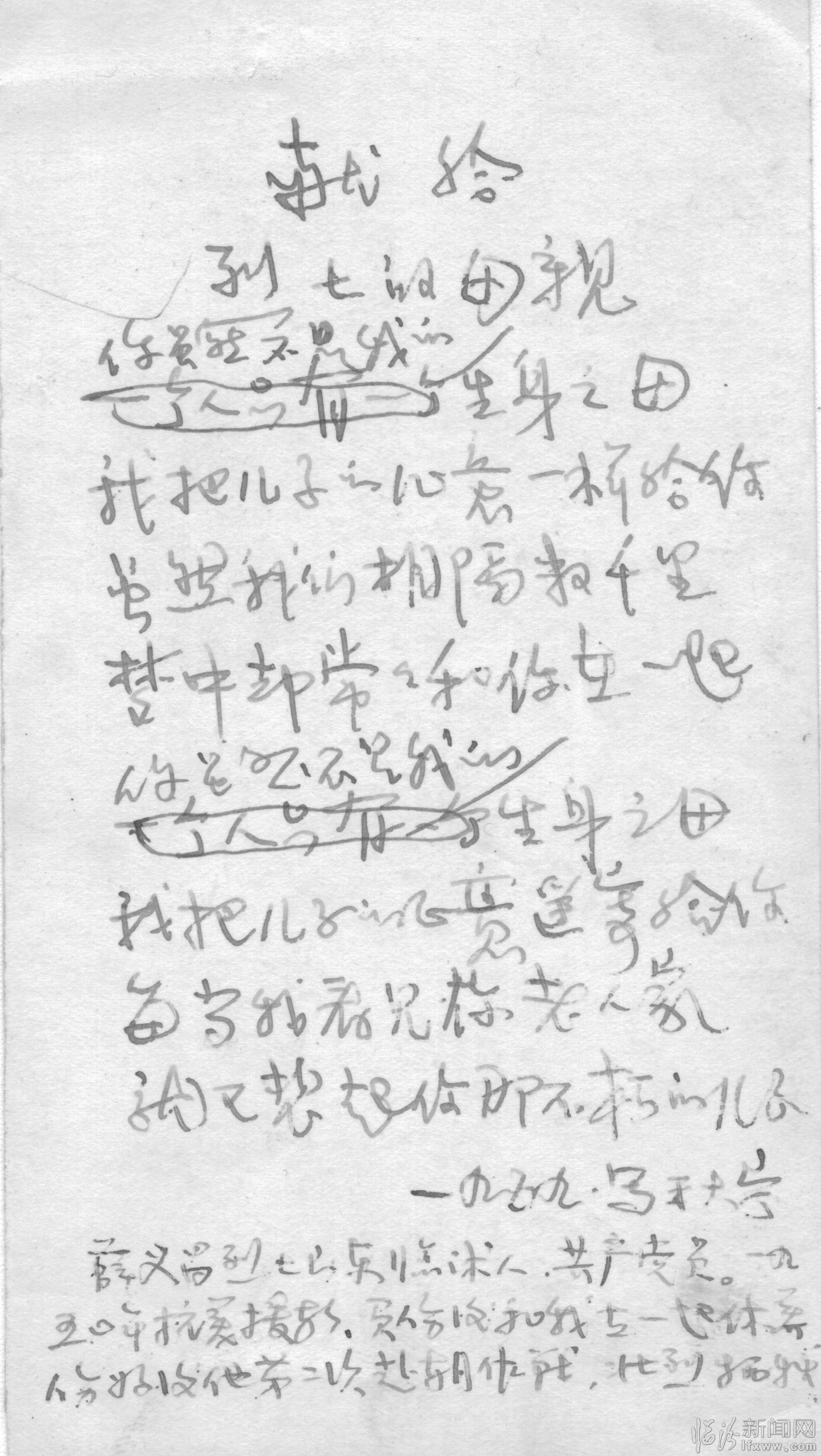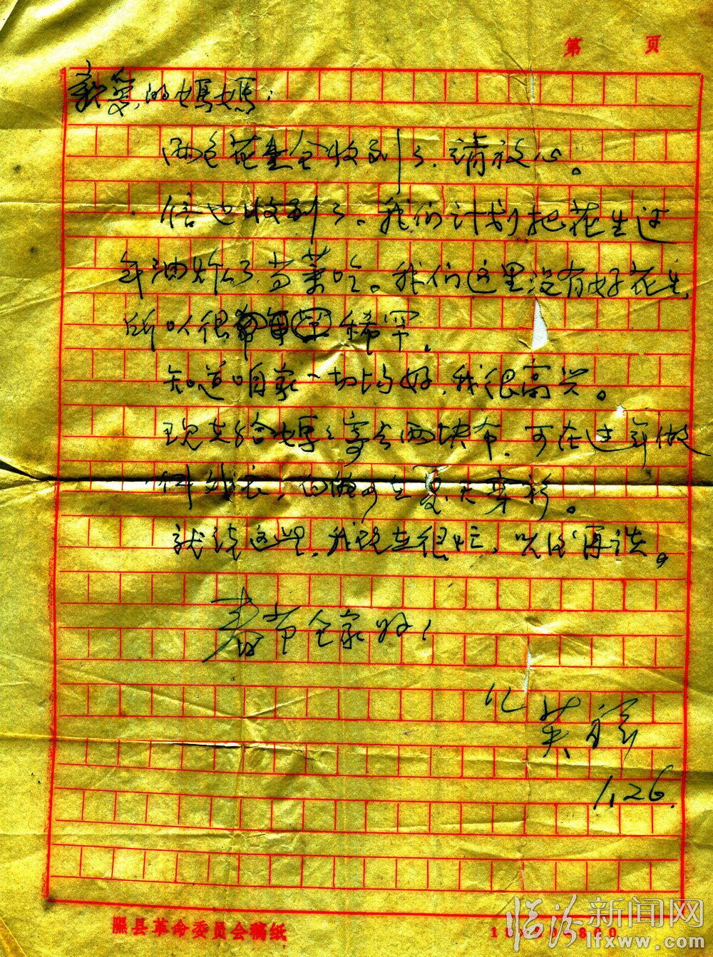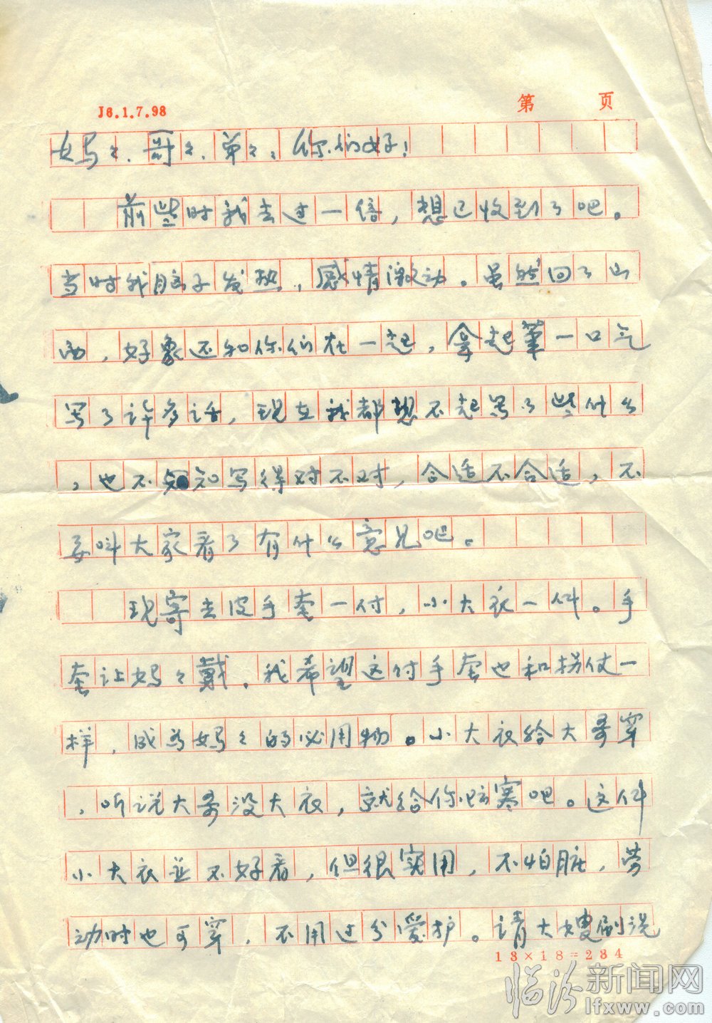 薛義昌不識字,父親初中沒畢業就參軍,在當時部隊算得是“知識分子”,薛義昌非常佩服,郝便成了薛的文化輔導員,教他讀書、寫字,為他念家信、寫家書。在交往中,父親了解到薛義昌的母親——一位33歲就守寡的婦人,含辛茹苦把他們兄妹4人拉扯大,親自送薛義昌參軍,淮海戰役前夕,又背著煎餅,挪動著一雙小腳,步行一百余里到部隊去看他……也就從此開始,父親的心目中深深刻上薛母的印跡。