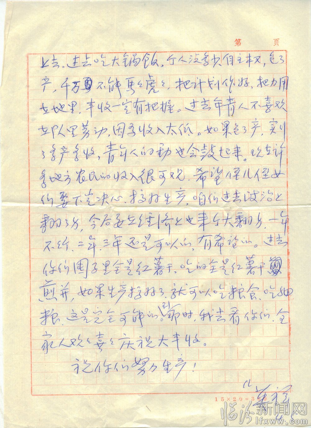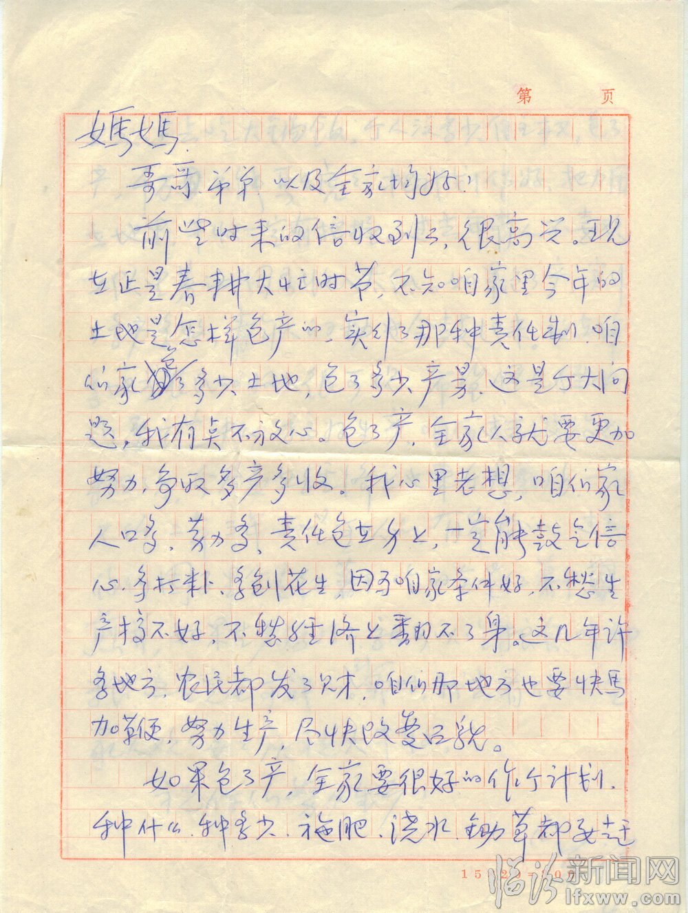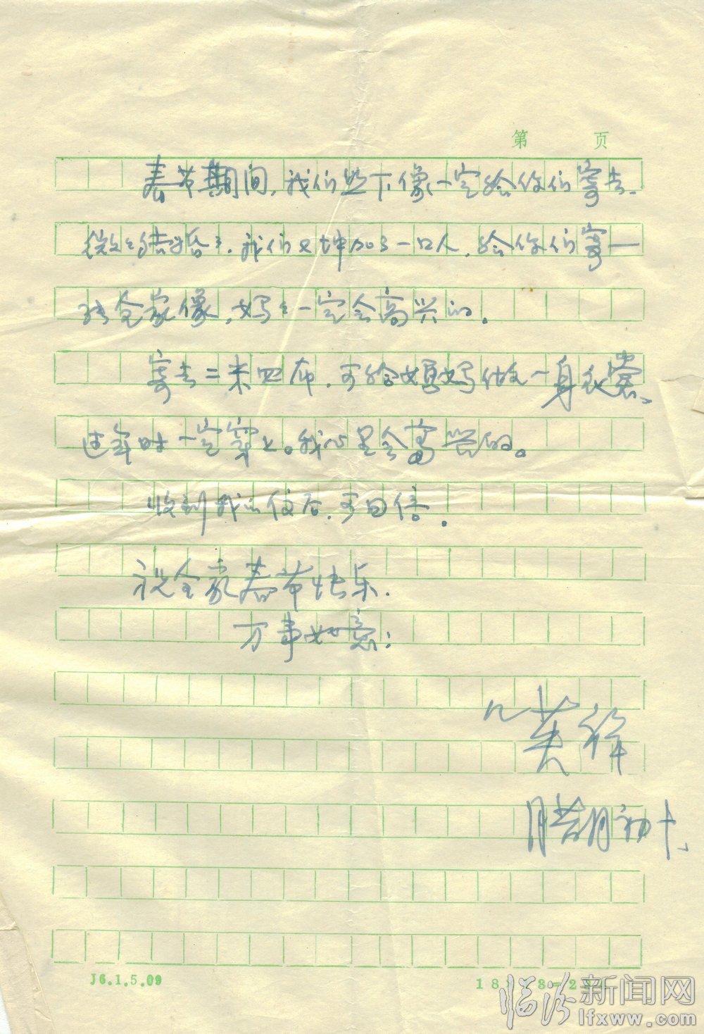 這封信是他幾十年給山東最短的一封信。他說的“我現在很忙”,其實是父親的生母,我們的奶奶病重,已在彌留之際,他整天服侍。他沒有告訴山東的媽媽,害怕她老人家掛念。就是這樣,他還是抽空買了藍、白兩塊布料寄給山東媽媽,還不忘叮嚀一塊“過年穿”,一塊“夏天穿”。