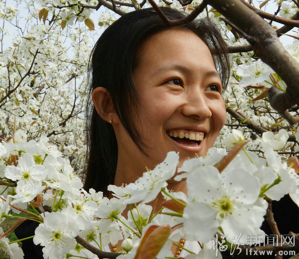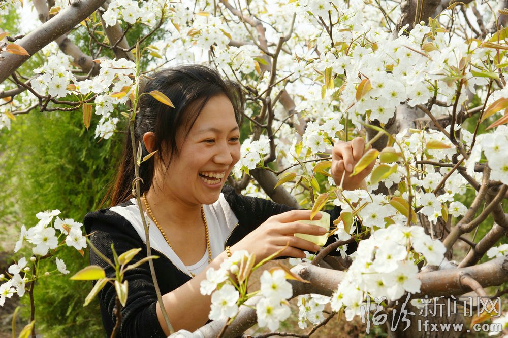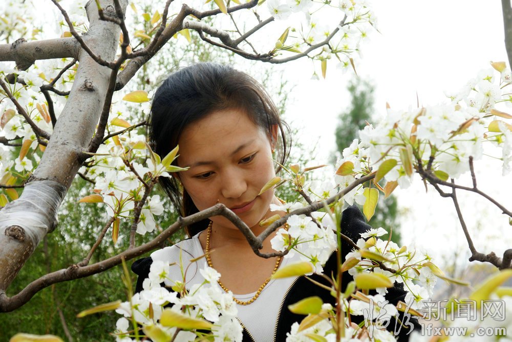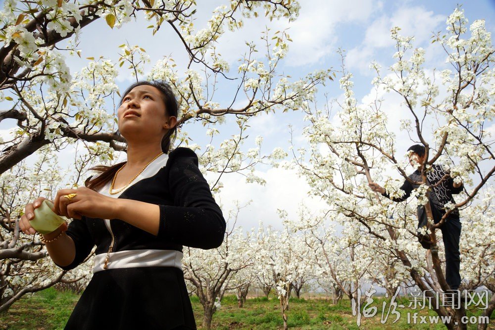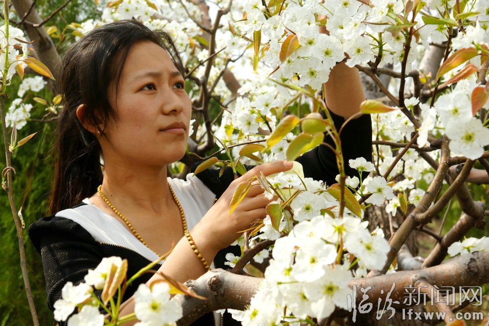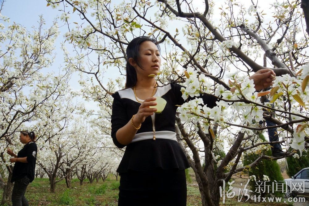 4月13日,正值隰縣第四屆玉露香梨花節期間,作家、攝影家采風團赴城南鄉龐村采風。走進一家果園,里面有幾個果農正在忙著為盛開的梨花人工授粉,有一位年輕姑娘立刻吸引了藝術家們,只見她身材高挑,面容嬌麗,衣著時尚,尤其是脖子上的項鏈、耳垂上的耳環、手腕上的手鐲、手指上的戒指更是光彩奪目。