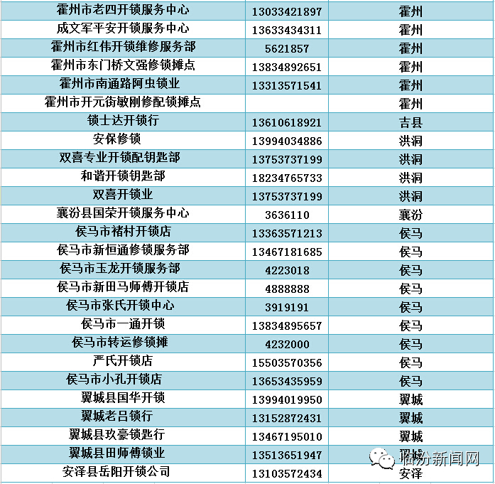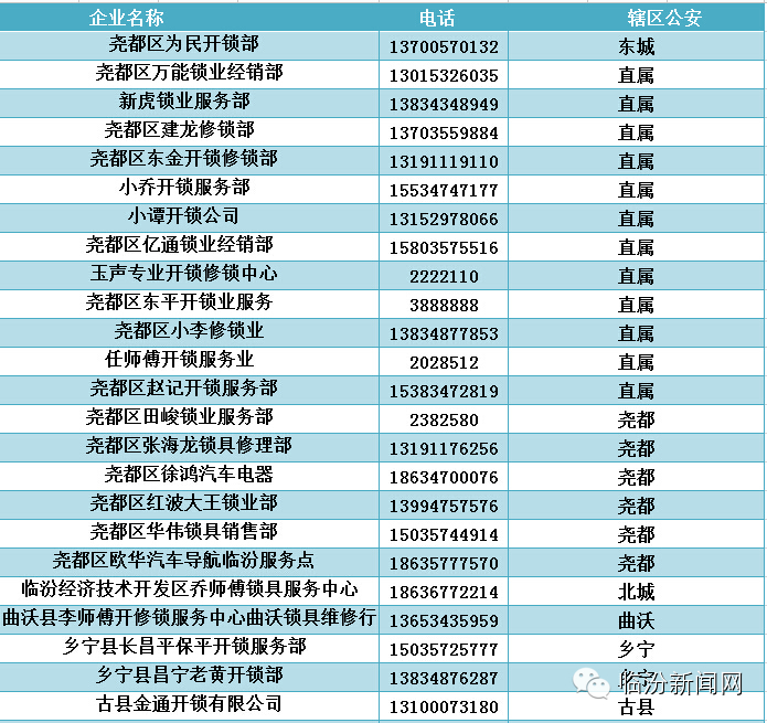 為切實加強我市開鎖企業的治安管理,預防和打擊利用開鎖技術從事的各類違法犯罪活動,保護廣大群眾的人身和財產安全,現將臨汾市公安機關備案的開鎖企業予以公布。