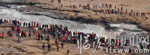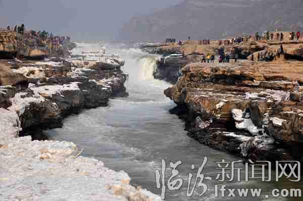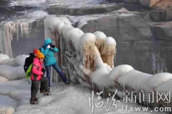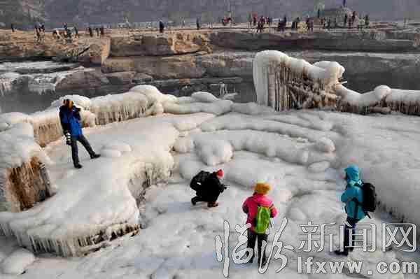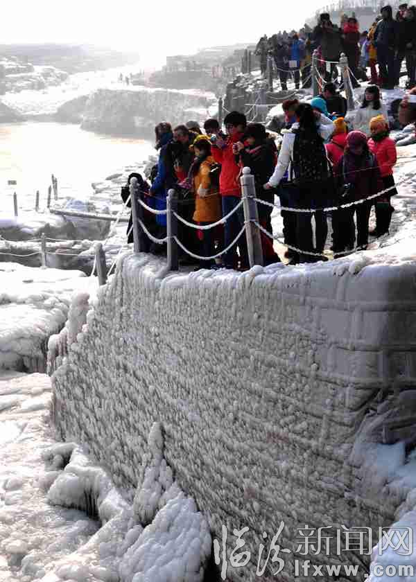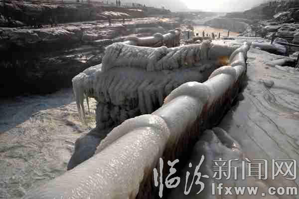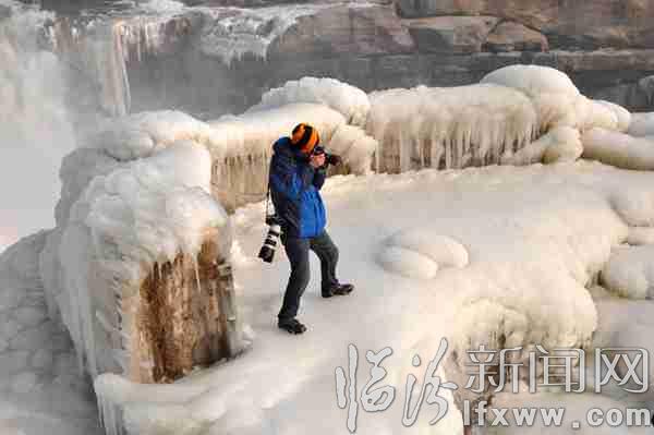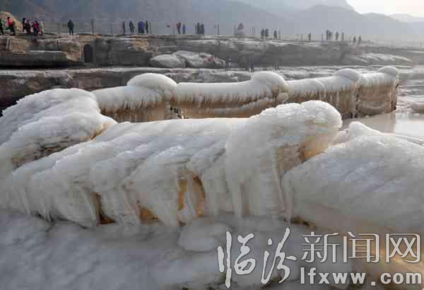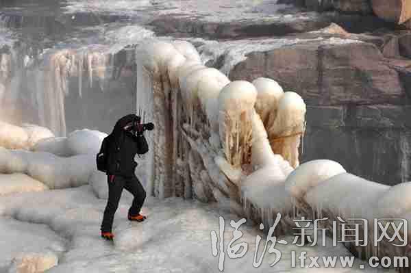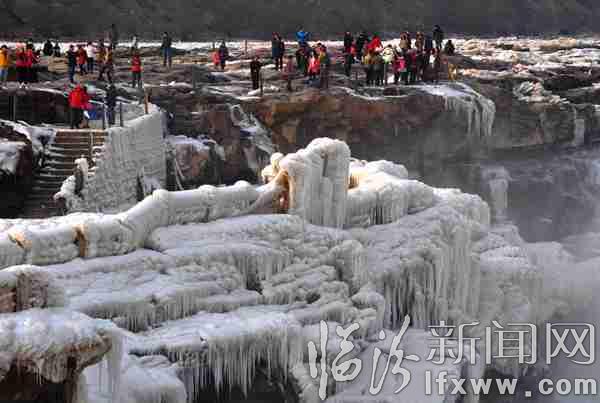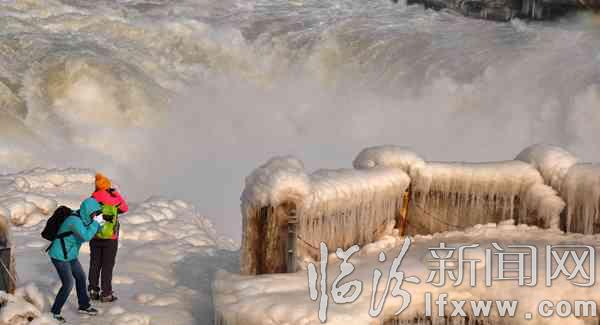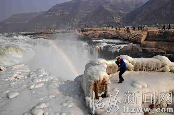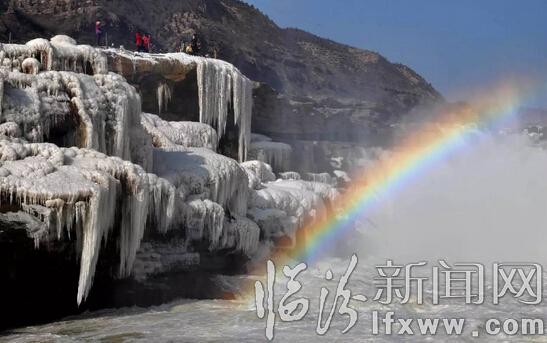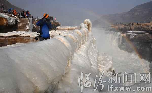 臨汾新聞網訊 受降溫天氣影響,黃河中游晉陜峽谷氣溫下降至零下十度以下,吉縣壺口瀑布滴水成冰,從瀑布腳下飛濺起來的浪花和彌天水霧在兩岸的巖石和護欄上凝結形成冰掛景觀,與瀑布上空飛舞的彩虹相映成輝,美不勝收。