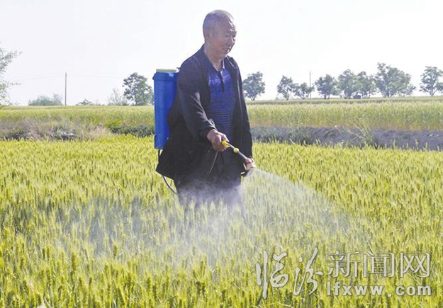 襄汾縣陶寺鄉74歲的張福德身背電動噴灑機,一大早就來到自家的麥田里,對小麥進行噴藥作業,消殺病蟲。記者王隰斌攝