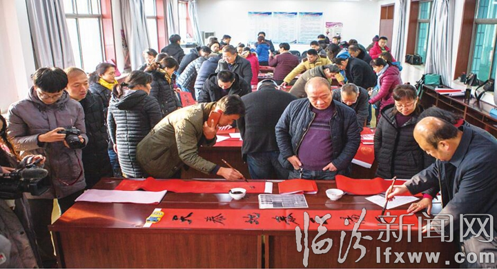 臨汾新聞網(wǎng)訊 一月十九日,襄汾丁陶書畫院的書法愛好者在為社區(qū)居民書寫春聯(lián)。當(dāng)日,襄汾丁陶書畫院組織十余名書法愛好者來到襄汾南莊社區(qū),開展了“寫春聯(lián),送祝福”活動,在為社區(qū)居民送去新春祝福的同時,更好地弘揚了書法這一優(yōu)秀傳統(tǒng)文化。