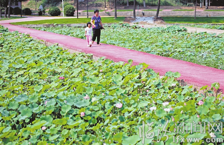 臨汾新聞網訊 近日,襄汾縣燕村荷花園內荷花陸續綻放,紅花綠葉交相輝映,美不勝收,吸引眾多游客前來觀賞。圖為游客在燕村荷花園觀賞荷花。