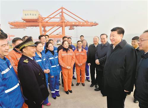2016年1月4日至6日,中共中央總書記、國家主席、中央軍委主席習近平在重慶調研。這是1月4日下午,習近平在重慶兩江新區果園港與現場作業人員親切交談。