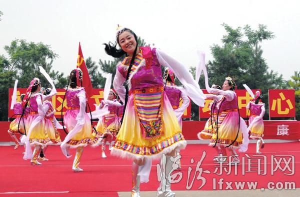 臨汾新聞網訊 6月30日,鄉寧縣240余名健身志愿者走進南閣社區,為該社區居民送上了一場精彩紛呈的文藝展演,來慶祝黨的94華誕。圖為健身志愿者們表演藏族舞《唱給卓瑪姑娘》。王娟 攝